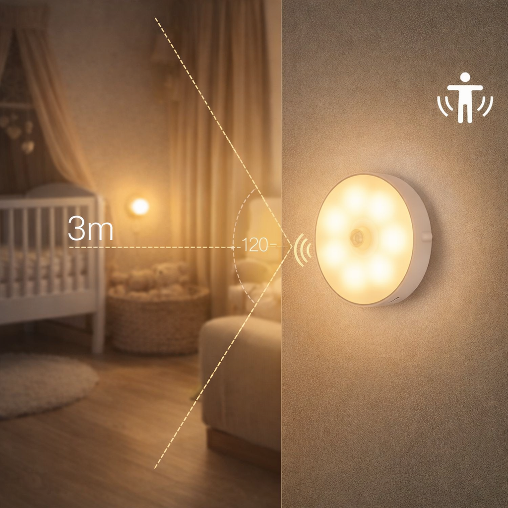 - Wbudowany czujnik ruchu wykrywa Twoją obecność nawet z odległości do 3 metrów, pod kątem 120°, i automatycznie uruchamia delikatne światło.